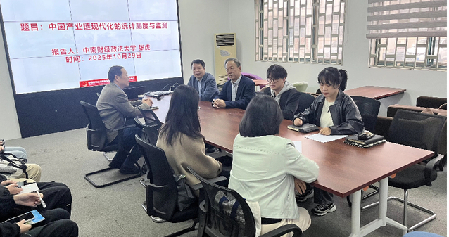本网讯(通讯员:刘江荣;审稿人:张耀峰)2025年10月29日,应中心邀请中南财经政法大学张虎教授在知行楼B124会议室,为中心研究员和科研助理作题为《中国产业链现代化的统计测度与监测》的报告。报告由中心常务副主任张耀峰主持,中心部分研究员和科研助理参加了报告会。